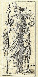 mythology: goddess Diana, who is traditionally related to this heavely body (the hound and arrow are her other typical attributes), is here depicted in the attitude of turning her eyes to the small crescent above her head. Also the nineteenth trump, the Sun, is based on a similar scheme: a small blazing sun spreads its rays from behind the head of god Apollo, who holds a lyre. In the Star, the Moon and the Sun, once again the allegory catches the observer's eye much more than the main subject of the trump does. The last two illustrations of the set, Judgement and the World, respectively feature a flying angel with a trumpet - the name of this subject in modern tarots of Bologna has remained the Angel - and Samson bearing the world on his shoulders. Strong analogies with these allegories can be found in the Minchiate and in Sicily's regional tarot (see page II). |
