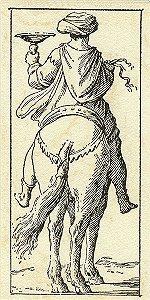 personage, though, has a beard. The subject is, in fact, one of the Popes, the four subjects with the same rank that in Bologna tarot temporarily took the place of all four civil and religious authorities (namely, the Popess, the Empress, the Emperor and the Pope itself), later turning into the Moors, a typical feature of the Tarocchino, as explained in page II. Mitelli's sixth allegory features a blindfolded Cupid with his bow and arrows, holding a flaming heart. The absence of the well-known loving couple shows well how the name of this subject in Bologna was still Love (i.e. not the Lovers), as it used to be in the nearby Ferrara and, more in general, in all the earliest tarots. Also the twelfth card of the set takes us back to the origins of the tarot. In fact, the old winged man helping his faltering pace with crouches is an allegory of Time, also known as the Old Man, which in tarots belonging to Dummett's group C (i.e. Marseille and others) was replaced with the Hermit, probably around the 16th century. Mitelli's graphic interpretation blends the two original names. |