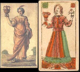 e fante femminile di Denari Caratteristiche simili a queste si trovano solo nei due tarocchi viscontei summenzionati, uno dei quali, indicato come Cary-Yale, non ha solo una distribuzione dei segni simile, ma fra le figure ha anche quattro fanti femminili (più altri quattro maschili). Tuttavia i tarocchi dei Visconti risalgono a un'epoca in cui gli stili delle carte da gioco dovevano ancora essere definiti, e sarebbe troppo rischioso proporre qualsiasi correlazione con le Minchiate, il cui schema nacque non meno di un secolo più tardi, ma forse anche più, in una diversa zona dell'Italia.