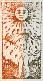 detto nella 2ª parte. Anche la Papessa, uno dei sei soggetti completi, è raffigurata seduta davanti ad un libro aperto poggiato su un leggìo, assistita da un chierico o forse da un piccolo monaco (a giudicare dalla tonsura): nelle successive edizioni, quest'ultimo personaggio venne abbandonato, così come pure il leggìo, ma non il libro. Fra i soggetti frammentari, il Sole è la carta all'estremità sinistra della terza fila. Ne vediamo la metà destra, nella quale il disco solare spande i suoi raggi tutt'attorno. Più sotto è la figura di un bambino o di un giovane, in piedi e privo di abiti, di cui si vede buona parte del corpo. |