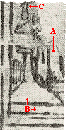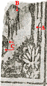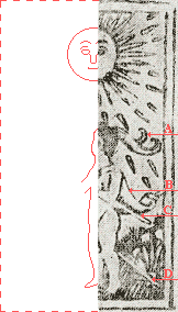 compatibile con la porzione residua. L'illustrazione a destra è stata disegnata e gentilmente fornita da Mario Ostidich (Milano); le parti in rosso sono ovviamente ipotetiche. I visitatori possono inviare la loro personale interpretazione della carta all'indirizzo e-mail del webmaster; fin quando sarà disponibile memoria residua sul server, verranno mostrate in questa pagina. Si prega di non inviare immagini più grandi di 35-40 Kbytes. Per completezza, dovremmo spendere qualche parola a proposito dei due frammenti più piccoli del foglio, cioè quelli negli angoli in alto a sinistra e a destra. |